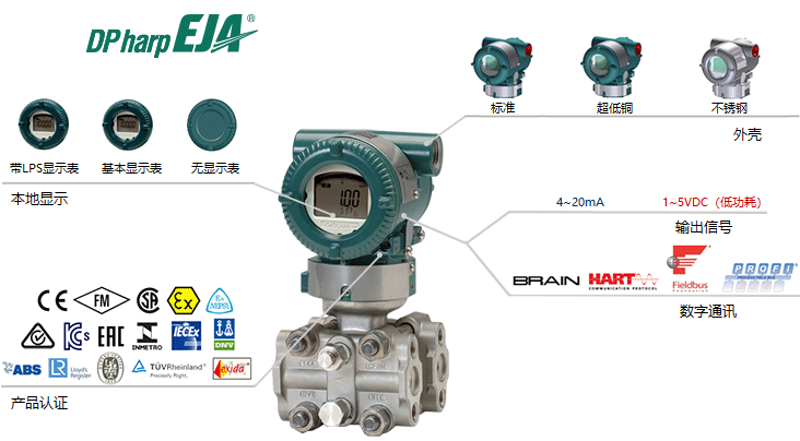 适用于测量液体、气体或蒸汽的流量、液位、密度和压力。EJA120E将测量差压转换成4~20mA DC电流信号输出,具有响应、远程设定和自诊断等功能。